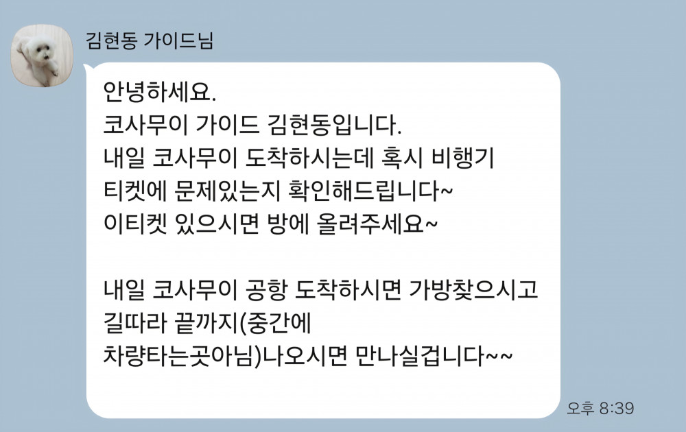 출발 전날부터 가이드님께서 따뜻한 인사와 함께 항공권을 꼼꼼히 확인해 주셔서 여행 전부터 든든함과 신뢰가 느껴졌습니다.
